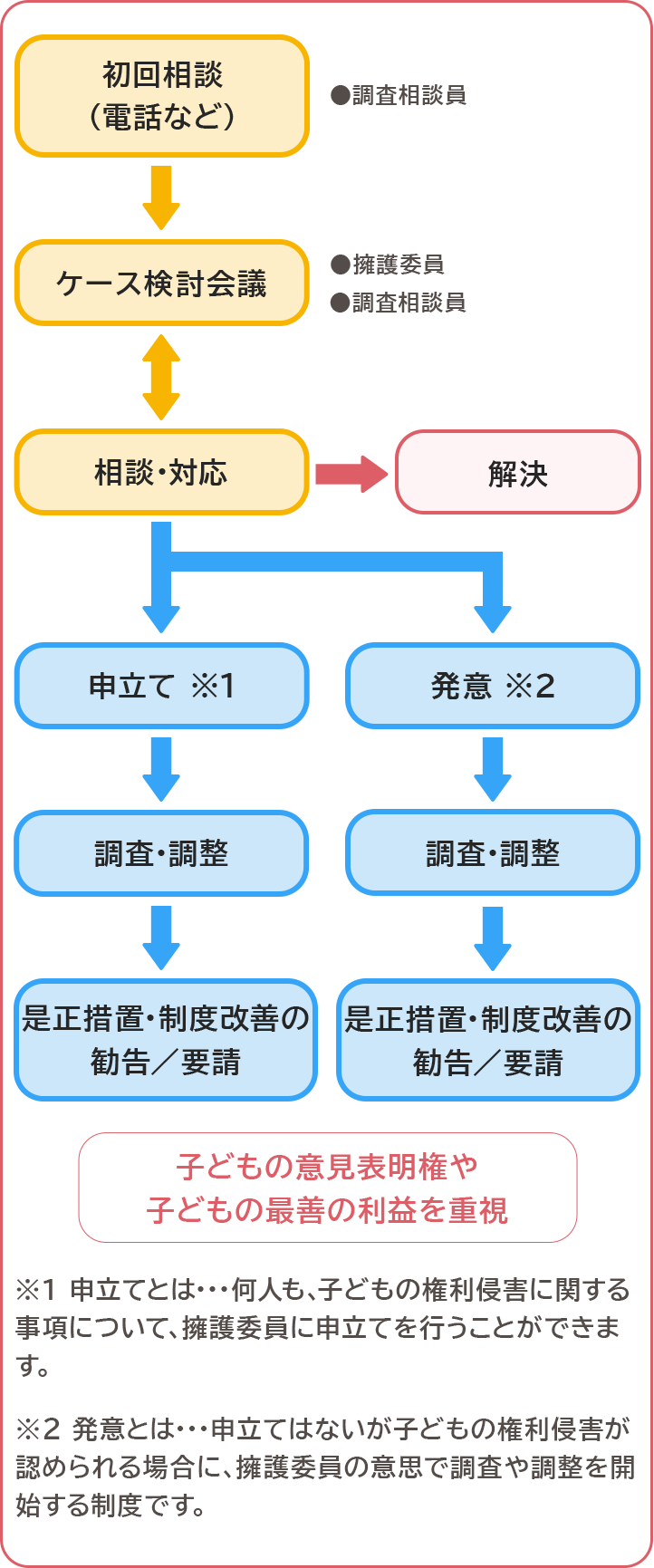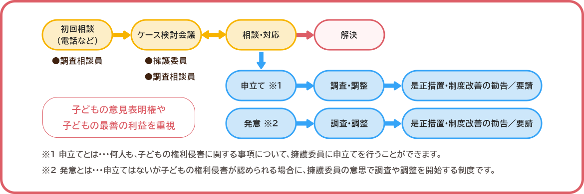 - 子どもの「最善の利益」を尊重し、子ども自身が解決の主体となれるようサポートします