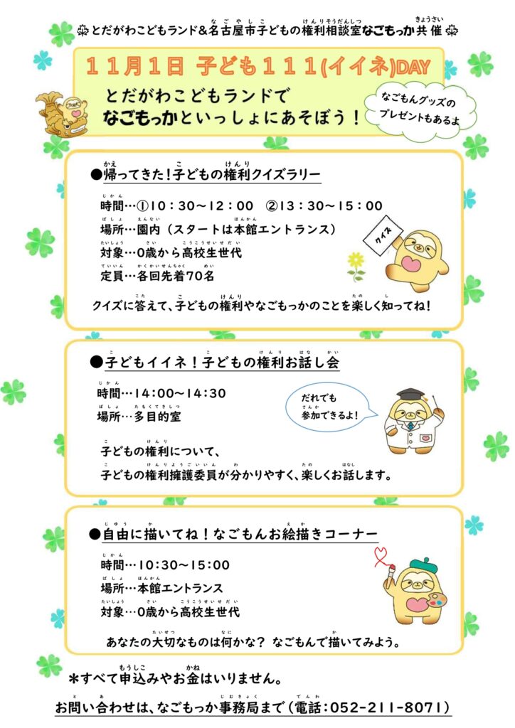 11月1日 子ども111(イイネ)DAY★とだがわこどもランドでなごもっかといっしょにあそぼう 2025.10.07 最終更新日時 : 2025.10.07 なごもっか管理者 11月1日に、とだがわこどもランドでクイズラリーをやります。お話し会やお絵描きコーナーもあります。ぜひ、あそびに来てくださいね。 (雨の時は、館内で行います。)